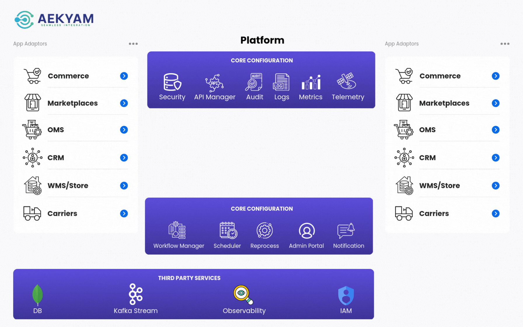 Aekyam comes with LCNC (Drag & Drop) for workflows integration, inbound or outbound connector library, Lambda functions, developer interface, data payload lifecycle traceability and dashboards.